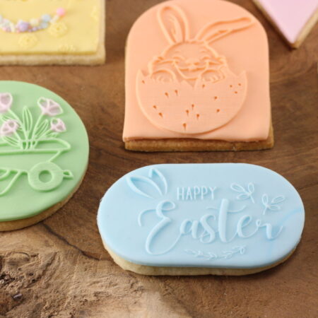 Deze fondantstempel met de tekst `Happy Easter` heeft met zijn schattige oortjes een perfect design voor jouw paascreaties!