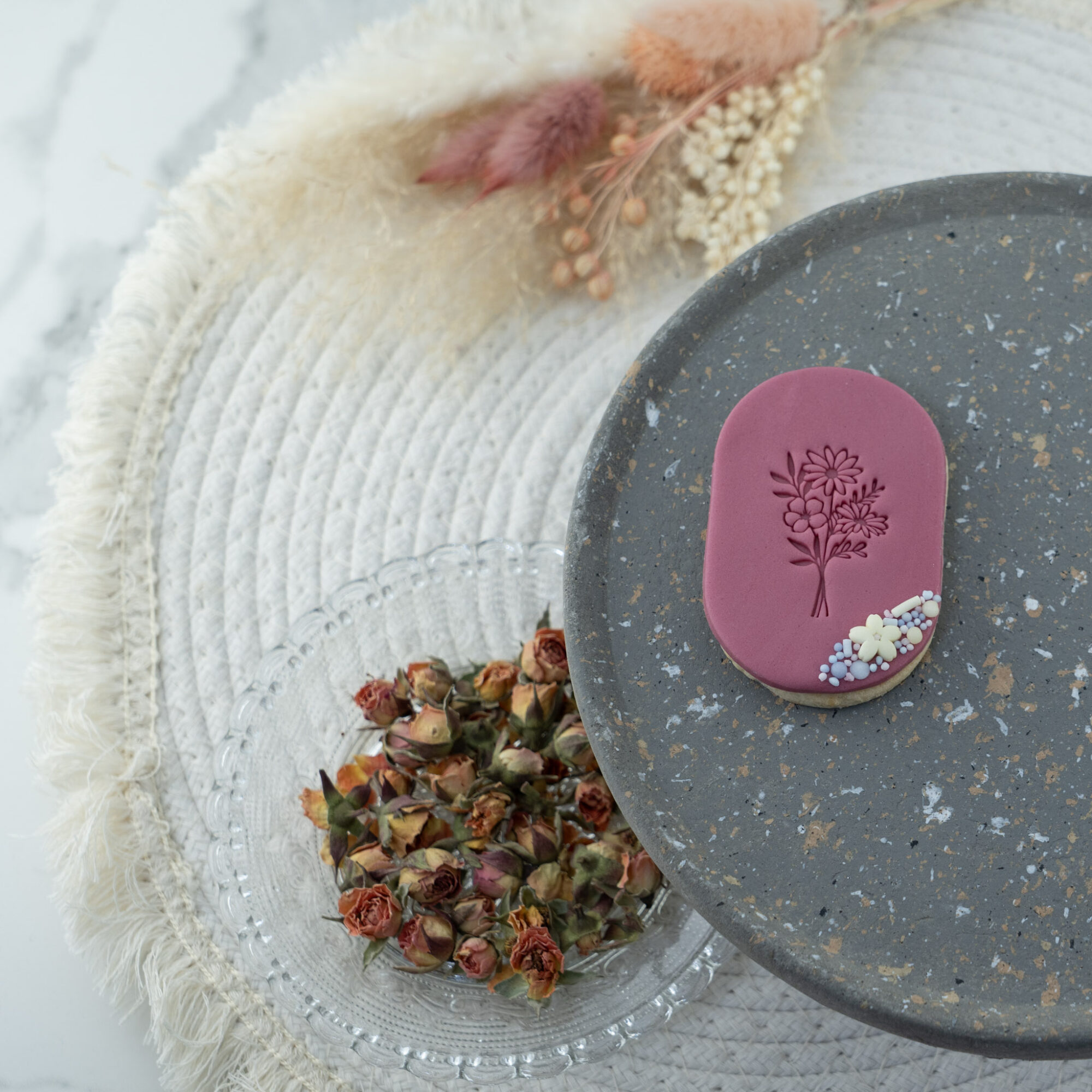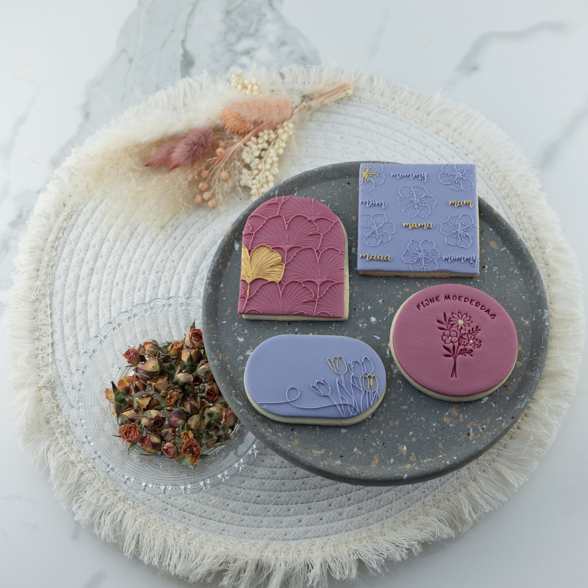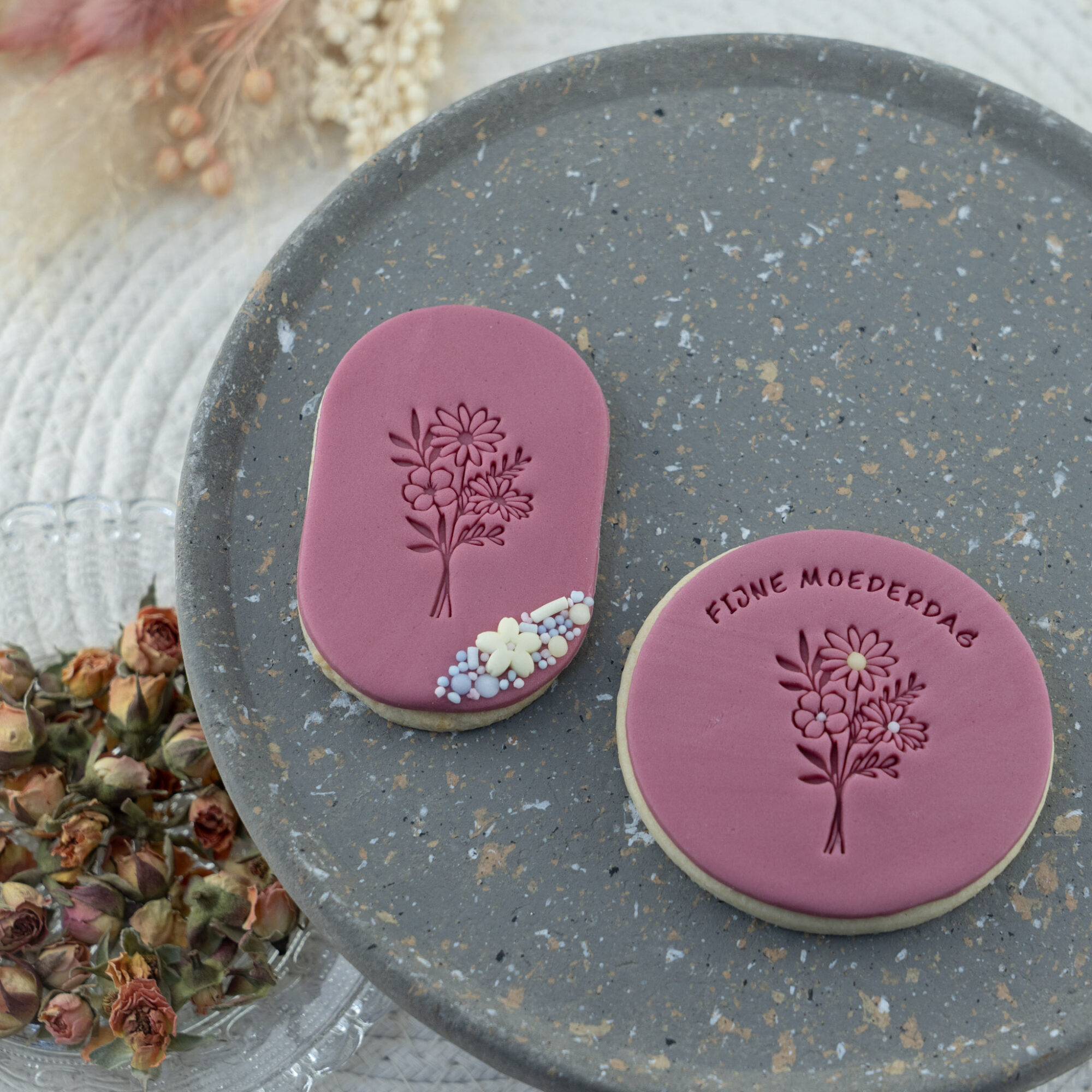 Met fondantstempels creëer je moeiteloos prachtige details op je bakcreaties. Denk aan een subtiel mamapatroon, een sierlijke bloemenprint of een inspirerende tekst. Zo geef je je baksels een extra speciale uitstraling. Stempel bijvoorbeeld een bosje bloemen op fondant of marsepein en maak een eetbaar kunstwerk voor jouw moeder! Combineer dit met roze of paarse kleuren en kleurrijke sprinkles voor een stijlvolle finishing touch.