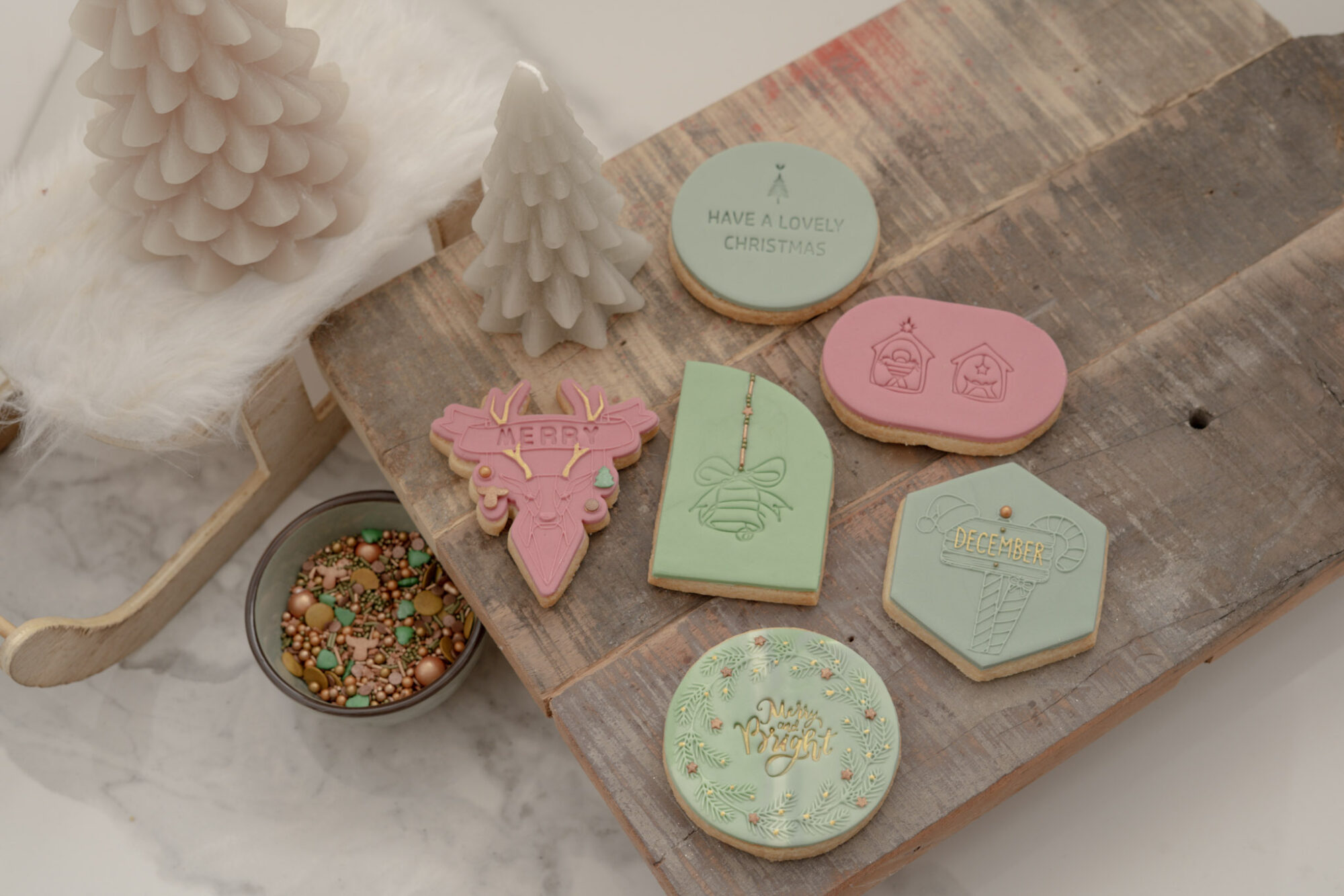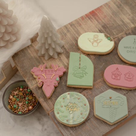 Fondantkoekjes zijn zachte en boterachtige lekkernijen, bedekt met een gladde laag glazuur die zich perfect leent voor Kerstversieringen. De mogelijkheden zijn eindeloos! De collectie zit boordevol feestelijke designs zoals een lieve engel, de kribbe, een klassieke kerstklok, een klassieke kerstkrans, vrolijke North Pole palen en zelfs een naambanner met hert – ideaal om jouw creaties te personaliseren!