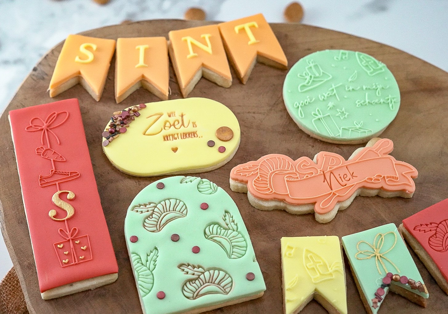 Impress fondantstempels zijn speciale stempels waarmee je eenvoudig afbeeldingen en patronen in fondant of marsepein kunt drukken. Deze stempels zijn ontworpen met gedetailleerde afbeeldingen die perfect aansluiten bij het Sinterklaasthema. Denk aan een gezette schoen, pietenmuts, teksten zoals wie zoet is, dank u sinterklaasje, een strikje zoals op een cadeau zit etc. Met één druk op de fondant creëer je een scherpe afdruk, die je vervolgens kunt uitsnijden of gebruiken als decoratie.