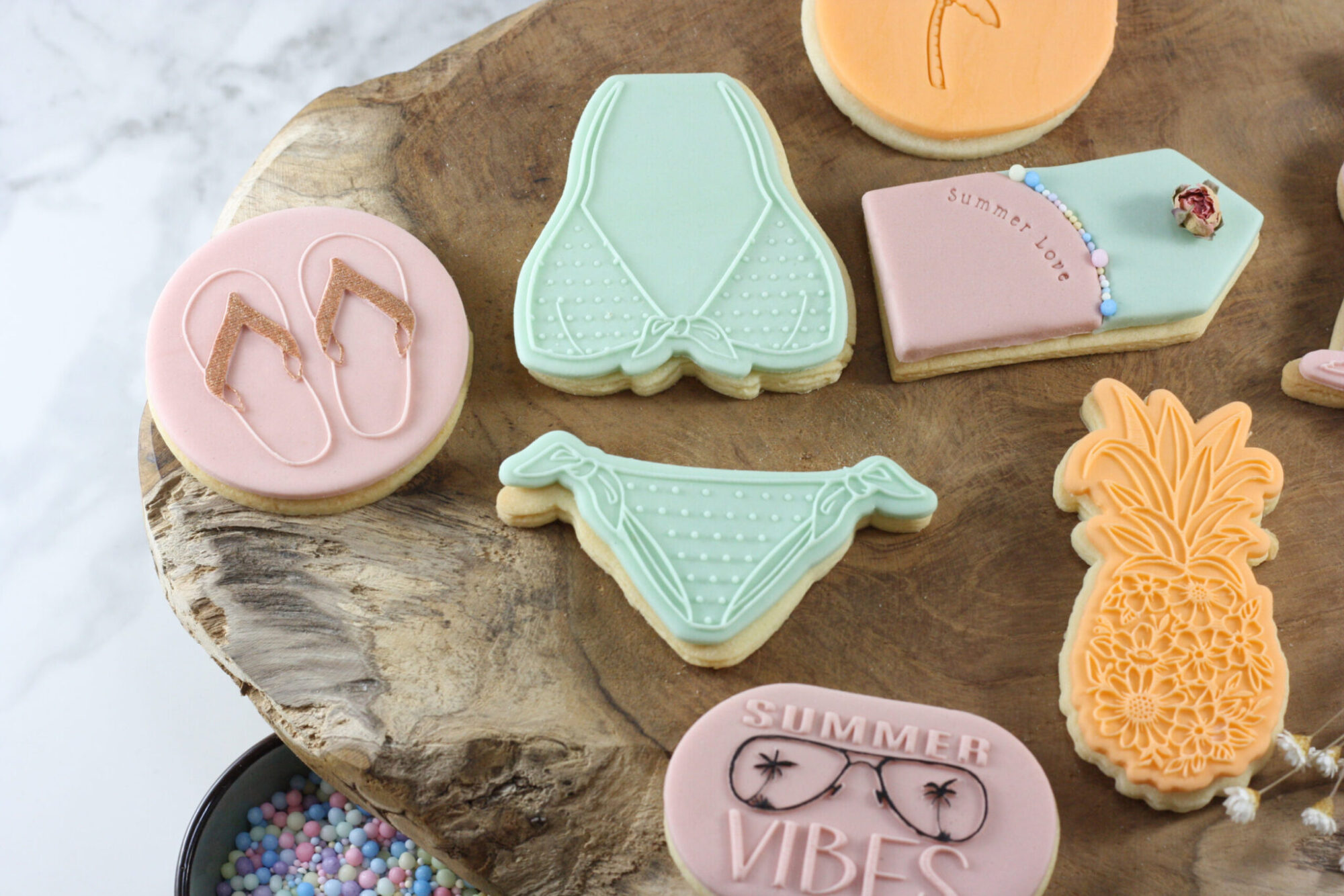 Voor een extra zomerse touch kun je gekleurde fondant gebruiken. Kleuren zoals geel, blauw, groen en roze passen perfect bij het zomerse thema en maken je creaties nog feestelijker. Combineer verschillende stempels en kleuren voor een speels en uniek resultaat dat zeker in de smaak zal vallen bij je gasten.
